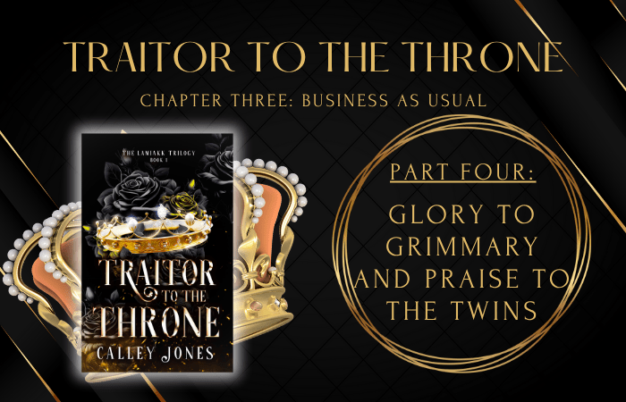 “Glory to Grimmary and praise to the Twins,” the students echoed. There had been a time, many years ago, when Thirtyx had to do some hefty mental gymnastics to say the customary morning greeting. The Verith council had coached him well. You do want to bring him glory. What better glory than for him to die a martyr for his cause? Fortunately, he now had no issue wishing Grimmary glory in the more conventional sense.